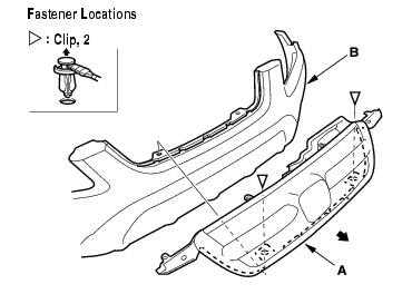 - Remove the clips, and remove the front grille (A) from the front bumper (B) by pulling it out. Take care not to scratch the front bumper.
