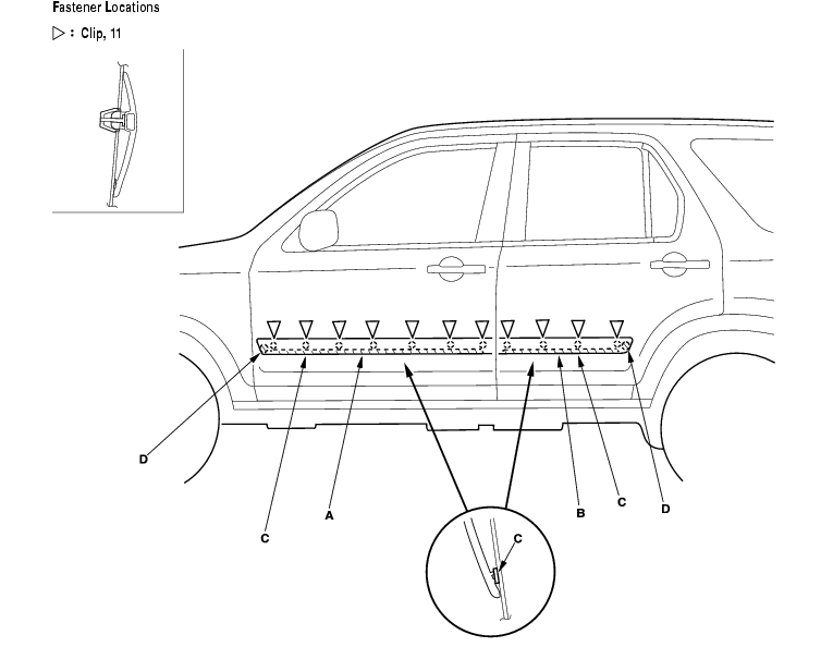 - Slide the side sill panel (D) forward, and remove it. The side clips (E) will stay in the body.