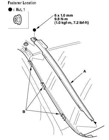 - Remove the nut, and detach the windshield side trim (A) from the retainer (B) by pulling the trim up. Take care not to scratch the body.