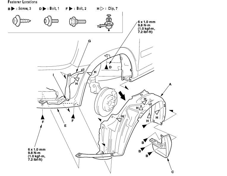 - From the wheel arch, remove the clips (H) securing the front inner fender (and splash shield) on the body.
