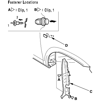 - Open the front door. From outside the door, remove the upper clip, and from inside the door, remove the lower clip securing the front fender fairing (A) and front fender (B).