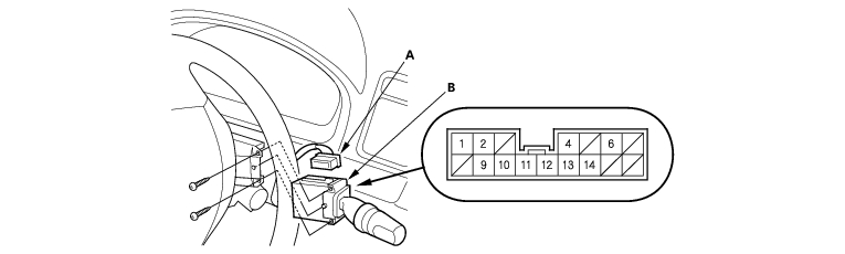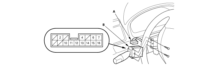 - Disconnect the 16P connector (A) from the combination light switch (B).