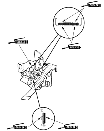 - Grease each location of the hood latch indicated by the arrows.