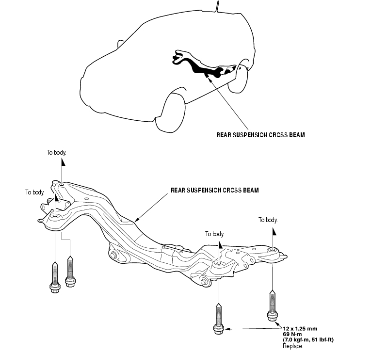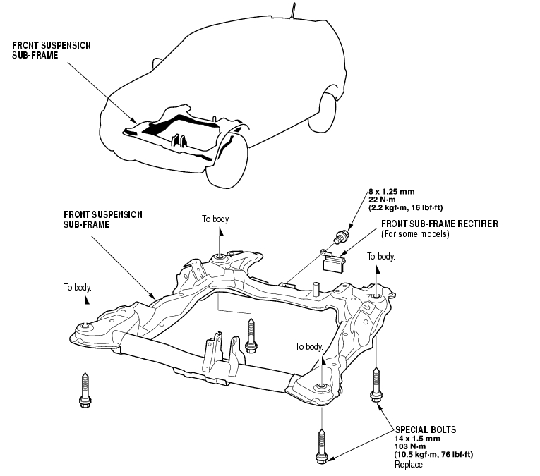 NOTE: After loosening the sub-frame mounting bolts, be sure to replace them with new ones.