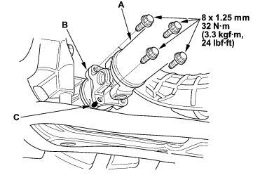 - Install the propeller shaft (A) onto the rear differential (B) by aligning the reference mark (C).