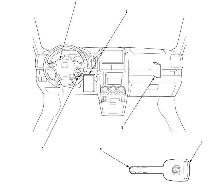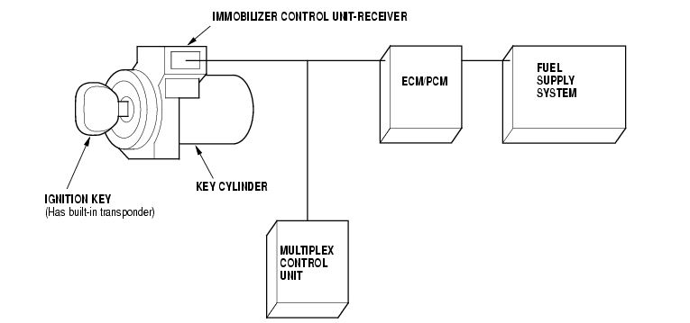 This system consists of a transponder located in the ignition key, an immobilizer control unit-receiver, an indicator light, the multiplex control unit, and the ECM/PCM.When the key is inserted in the ignition switch and turned to the (II) position, the immobilizer control unit-receiver sends power to the transponder in the ignition key. The transponder then sends a coded signal back through the immobilizer control unit-receiver to the ECM/PCM. The ECM/PCM then energizes the fuel supply system.