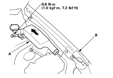 - Remove the bolt, then separate and remove the filler neck (A) from the washer reservoir (B).