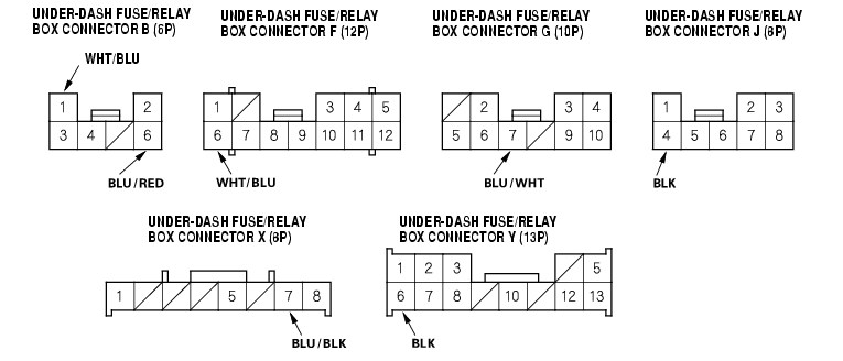 - Disconnect the under-dash fuse/relay box connectors B, F, G, J, X and Y.
