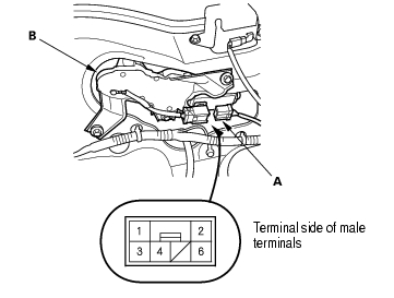 - Disconnect the 6P connector (A) from the wiper motor (B).