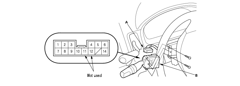 - Disconnect the 14P connector (A) from the wiper/washer switch (B).