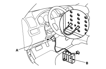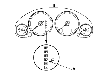 When the PCM senses an abnormality in the input or output systems, the [D] indicator (A) in the gauge assembly (B) will usually blink and/or the Malfunction Indicator Lamp (MIL) may come on. When the Data Link Connector (located under the dash behind the center console) is connected with the special tool (DLC Pin Box), and the SCS signal terminal is connected to ground with the jumper wire at the special tool. The [D] indicator will blink the Diagnostic Trouble Code (DTC) when the ignition switch is turned ON (II).
