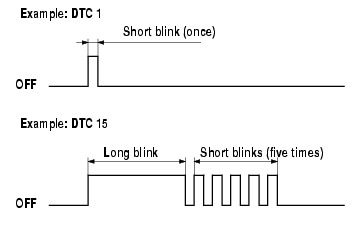 Codes 1 through 9 are indicated by individual short blinks. Code 10 and above are indicated by a series of long and short blinks. One long blink equals 10 short blinks. Add the long and short blinks together to determine the code. After determining the code, refer to the DTC Troubleshooting Index.