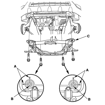 - Install the sub-frame (A). Align the reference lines (B) on the sub-frame with the bolt head center, then tighten the bolts.