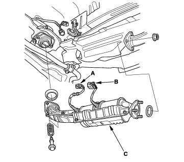 - Remove the Three Way Catalytic Converter (TWC) assembly (C) (K20A4, K24A1 engines) or exhaust chamber (C) (K20A5 engine).