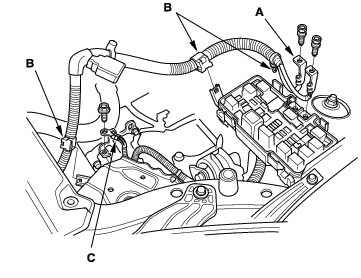 - Remove the battery cables (A) from the under-hood fuse/relay box, then remove the harness clamps (B) and ground cable (C).