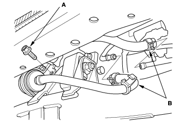 - Disconnect the compressor clutch connector (A), then remove the A/C compressor (B) without disconnecting the A/C hoses.