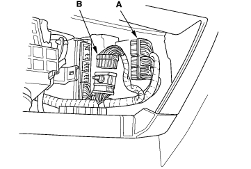 - Remove the harness clamps (A) and grommet (B), then pull the engine wire harness through the bulkhead.