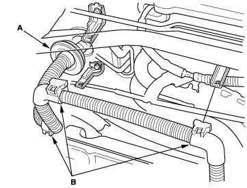 - Install the upper radiator hose (A) and heater hoses (B).