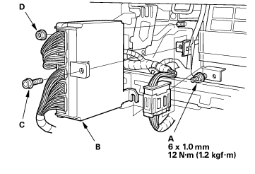 - Loosen the mounting nut (A) on the lower portion of the PCM (B), and remove the mounting bolt (C) and nut (D).