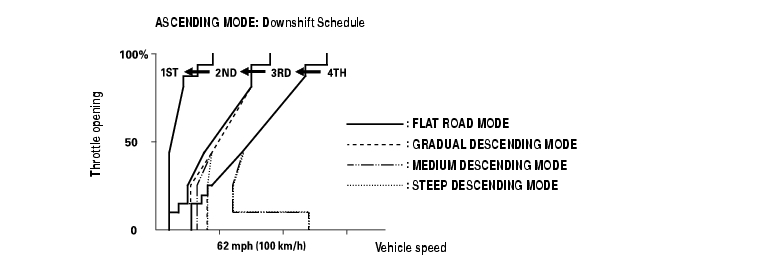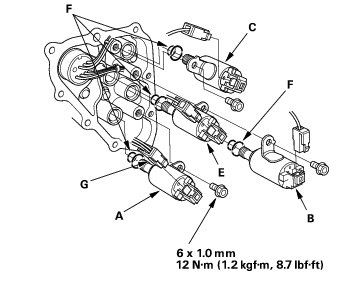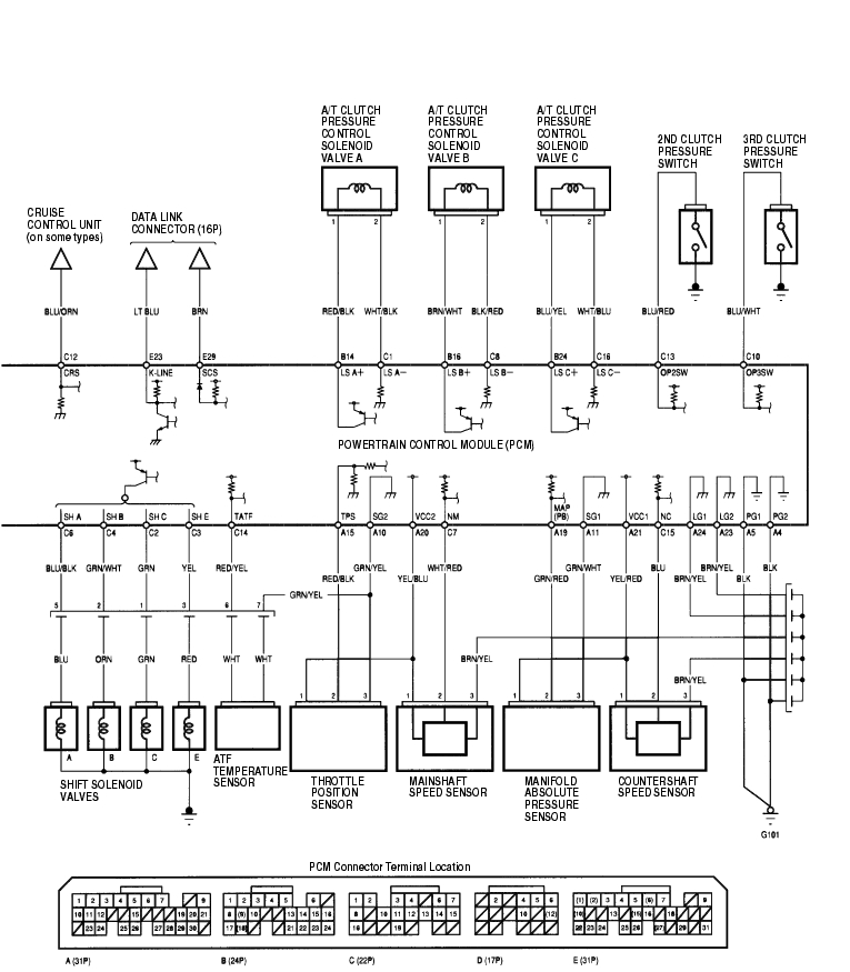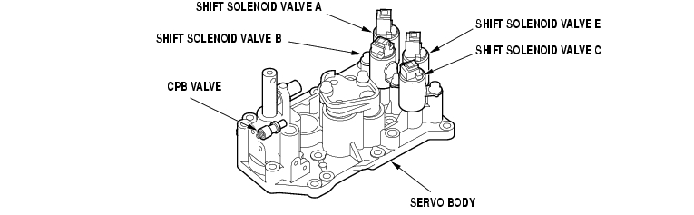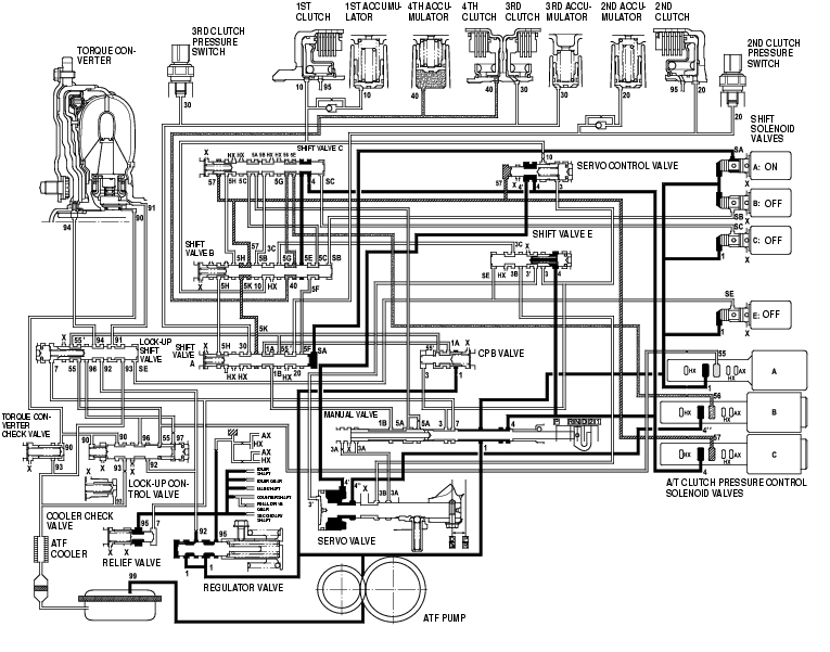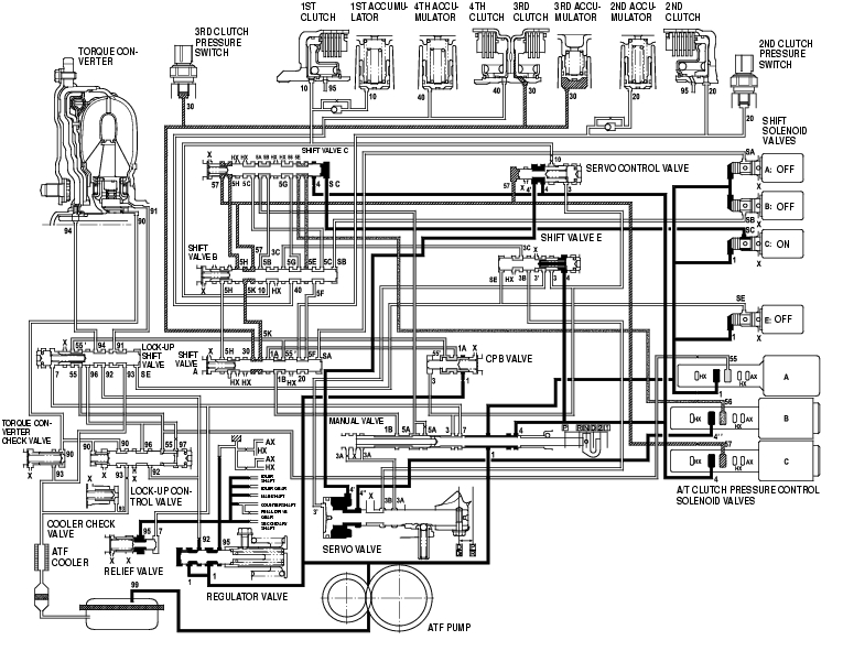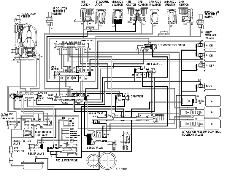 The PCM controls to shift gears the shift solenoid valves A, B, C, and E, and the A/T clutch pressure control solenoid valves A, B, and C, while receiving input signals from various sensors and switches located throughout the vehicle. The shift solenoid valves shift the positions of the shift valves to switch the port leading hydraulic pressure to the clutch. The A/T clutch pressure control solenoid valves A, B, and C regulate their respective pressure, and pressurize to the clutches to engage it and its corresponding gear. The pressures of the A/T clutch pressure control solenoid valves also apply to the shift valves to switch the port.