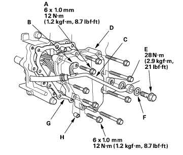 - Attach the torque converter to the drive plate with eight bolt (A). Rotate the crankshaft pulley as necessary to tighten the bolts to 1/2 of the specified torque, then to the final torque, in a crisscross pattern. After tightening the last bolt, check that the crankshaft rotates freely.