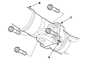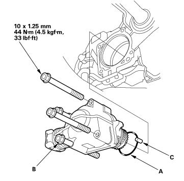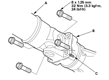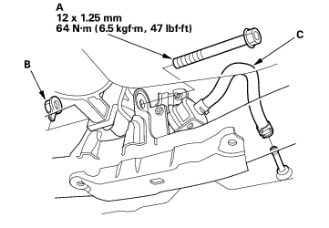 - Install the front mount bolt (A) and nut (B), connect the ATF cooler hose (C) to the ATF cooler line, then secure the hose with the clip (see page 14-151) .