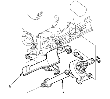 - Secure the shift cable bracket (B) with the bolts (A), and install the shift cable cover (C) with installing the mounting bolts loosey.