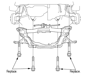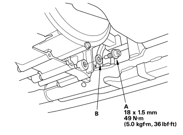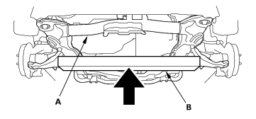 - Align the reference marks (A) with the center of the sub-frame mounting bolts (B), then tighten the bolts to the specified torque.