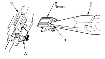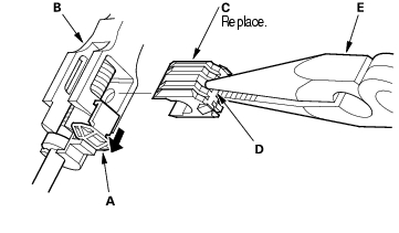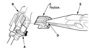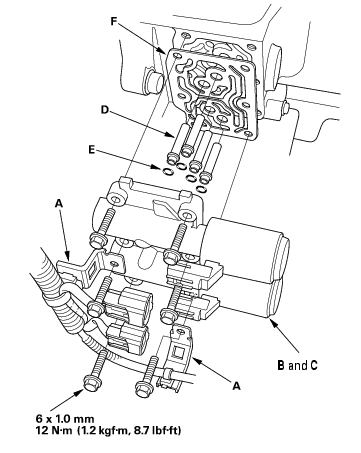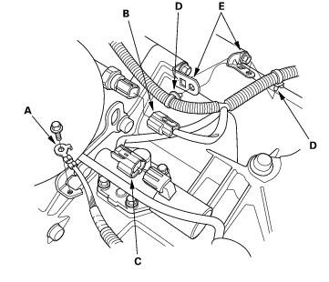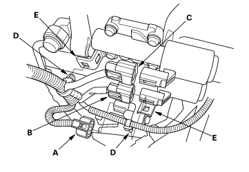 - Connect the shift solenoid harness connector (A), A/T clutch pressure control solenoid valve B connector, and solenoid valve C connector. Install the harness clamps (D) on the clamp brackets (E).