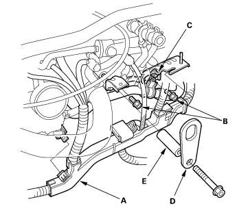 - Install the water pipe bolts (C), and tighten the air cleaner housing mounting bracket bolt (D). Install harness cover (E).