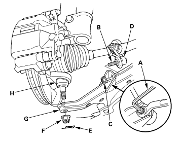 - Connect the ball joints (F) to the lower arms, and install the nuts (G). Insert a 5 mm Allen wrench (H) in the top of the ball joint pins, and tighten the nuts.