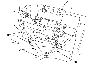 - Connect the ATF cooler hoses (A) to the ATF cooler lines (B) (see page 14-151) .
