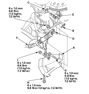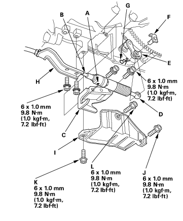 - Secure the shift cable bracket (H) with the bolts, and install the shift cable cover (I) with installing the mounting bolts loosely.
