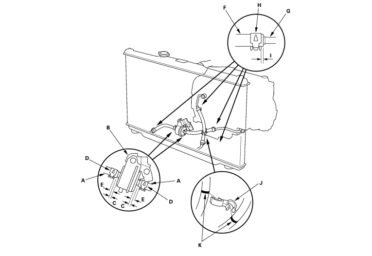 - Install the hose clamp (J) on the marks (K) on the ATF cooler hoses.