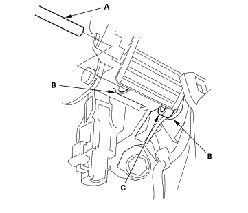 - Insert a 6.0 mm (0.24 in.) pin (A) into the positioning hole (B) on the shift lever bracket base through the positioning hole (C) on the shift lever. The shift lever is secured in [R] position.