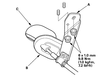 - Install the shift cable bracket (A) on the body, then install the grommet (B) in its hole (C).