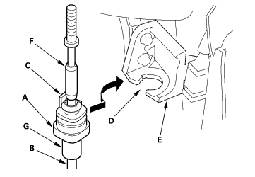 - Rotate the socket holder (A) on the shift cable (B) to face the tab (C) on the holder opposite to the opening (D) in the socket holder bracket (E). Align the holder with the opening the bracket, then slide the holder into the bracket. Rotate the holder a quarter turn to secure the shift cable. Do not install the shift cable by twisting the shift cable guide (F) and damper (G).