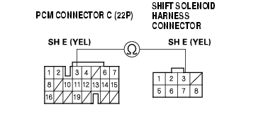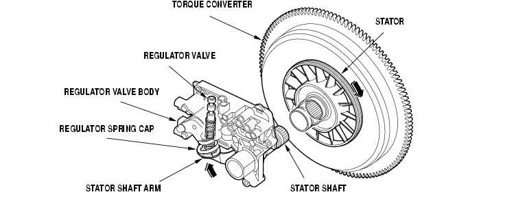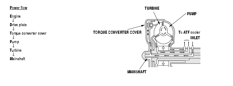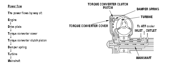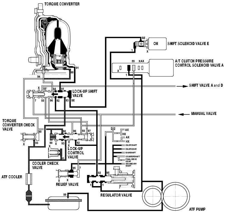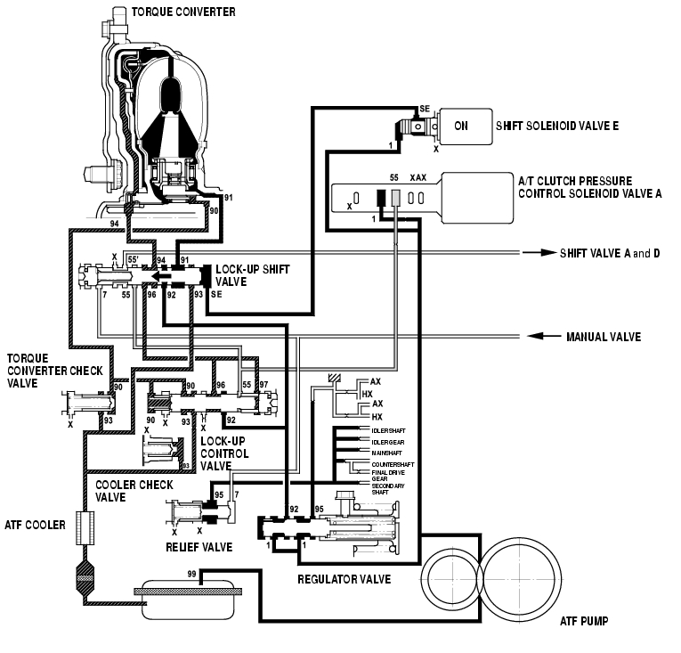 The lock-up mechanism operates in [D] position (3rd and 4th) and [D] position over-drive off mode (3rd). The pressurized fluid is drained from the back of the torque converter through a fluid passage, causing the torque converter clutch piston to be held against the torque converter cover. As this takes place, the mainshaft rotates at the same speed as the engine crankshaft. Together with the hydraulic control, the PCM optimizes the timing and volume of the lock-up mechanism. When the shift solenoid valve E is turned on by the PCM, shift solenoid valve E pressure switch the lock-up shift valve lock-up on and off. The A/T clutch pressure control solenoid valve A and the lock-up control valve control the volume of the lock-up conditions.