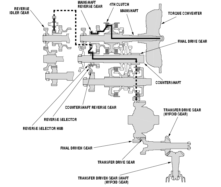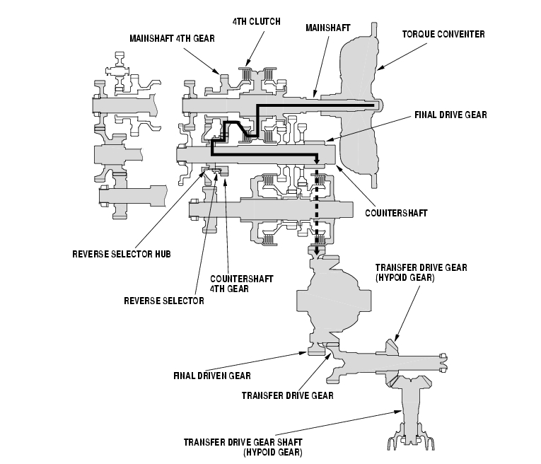 The torque converter consists of a pump, turbine, and stator assembly in a single unit. They are connected to the engine crankshaft so they turn together as the engine turns. Around the outside of the torque converter is a ring gear which meshes with the starter pinion when the engine is being started. The entire torque converter assembly serves as flywheel while transmitting power to the transmission mainshaft, the transmission has three parallel shafts; the mainshaft, the countershaft, the secondary shaft. The mainshaft is in line with the engine crankshaft, and includes the 3rd and 4th clutches, and gears for 3rd, 4th, reverse, and idler. The mainshaft reverse gear is integral with the mainshaft 4th gear. The countershaft includes the gears for 1st, 2nd, 3rd, 4th, reverse, park, and the final drive. The final drive gear is integral with the countershaft. The countershaft 4th gear and the countershaft reverse gear can be locked to the countershaft providing the 4th or reverse gear, depending on which way the selector is moved. The secondary shaft includes the 1st and 2nd clutches, and gears for 1st, 2nd, and idler. The idler shaft is located between the mainshaft and secondary shaft, and the idler gear transmits power between the mainshaft and the secondary shaft. The gears on the mainshaft and the secondary shaft are in constant mesh with those on the countershaft. When certain combinations of gears in the transmission are engaged by the clutches, power is transmitted from the mainshaft and the secondary shaft to the countershaft provide [D], [2], [1], and [R] positions.