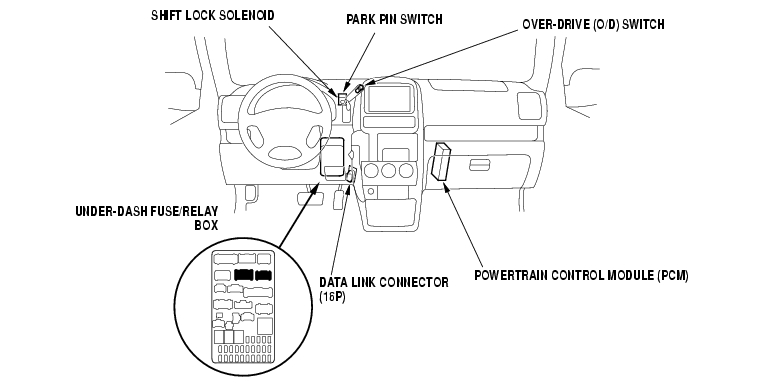 The electronic control system consists of the Powertrain Control Module (PCM), sensors, and solenoid valves. Shifting and lock-up are electronically controlled for comfortable driving under all conditions. The PCM is located below the dashboard, behind the glove box.
