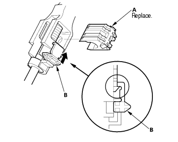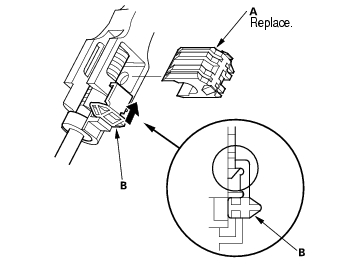 - Install the new shift cable lock (A) to secure the shift cable end and shift cable end holder, then push the lock tab (B) up unitil it stops to lock the joint.