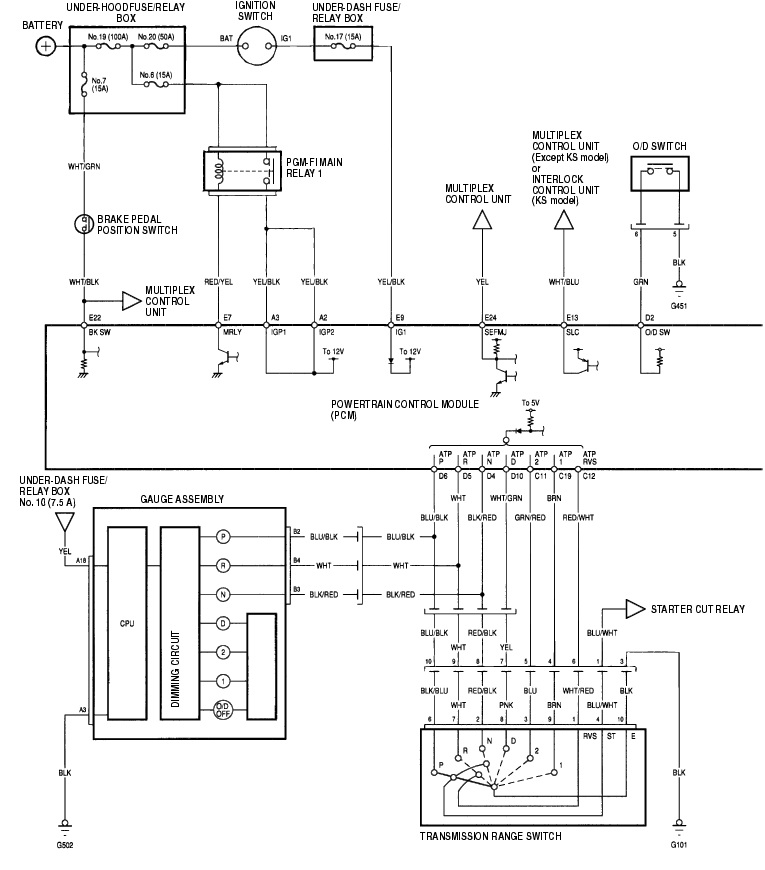 When you turn the ignition switch ON (II), the [D] indicator comes on and stays on or never comes on at all Communication line between multiplex control unit and gauge assembly defective Blown indicator bulb Check that the MIL indicates code for communication line between the multiplex control unit and gauge assembly (see page 22A- 231) . If the MIL does not indicate code, replace the indicator bulb (see page 14-171) . [D], [2], or [1] indicator does not indicate while the shift lever is in that position Over-drive (O/D) switch does not operate even though the switch is pushed in [D] position A problem in the O/D switch circuit Check the O/D switch circuit (see page 14-106) . Shift lever cannot be moved from [P] position while you're pushing on the brake pedal A problem in the shift lock system (interlock system) Check the interlock system - shift lock system circuit (see page 14- 175) . Shift lever cannot pass through [R] position from [N] position A problem in the reverse lock system of interlock system Check the interlock system - reverse lock system circuit (see page 14-178) . Ignition key cannot be moved from ACC (I) position to LOCK (0) position, when you're pushing it with the shift lever in [P] position A problem in the key interlock system (interlock system) Check the interlock system - key interlock system circuit (see page 14-179) .