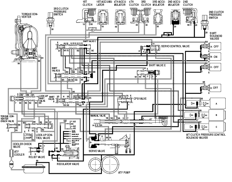 The valve bodies include the main valve body, the regulator valve body, and the servo body. They are bolted to the torque converter housing. The main valve body contains the manual valve, the shift valves A, B, C, and E, the relief valve, the lock-up control valve, the cooler check valve, the servo control valve, and the ATF pump gears. The regulator valve body contains the regulator valve, the torque converter check valve, lock-up shift valve, and the 1st accumulator. The servo body contains the servo valve, the CPB valve, accumulators for 2nd, 3rd and 4th and shift solenoid valves for A, B, C, and E. Fluid from the regulator passed through the manual valve to the various control valves. The 1st and 3rd clutches receive fluid their respective feed pipes, and the 2nd and the 4th clutches receive fluid from the internal hydraulic circuit.