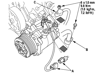 - Connect a R-134a refrigerant recovery/recycling/charging station (A) to the high-pressure service port (B) and the low-pressure service port (C), as shown, following the equipment manufacturer's instructions.