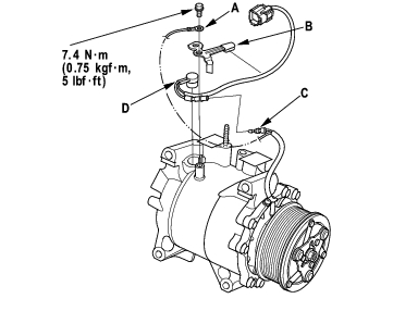 - Remove the bolt and holder (A), then disconnect the field coil connector (B). Loosen the clamp screw (C) to free the field coil wire. Remove the snap ring (D) with snap ring pliers, then remove the field coil (E). Be careful not to damage the field coil and compressor.
