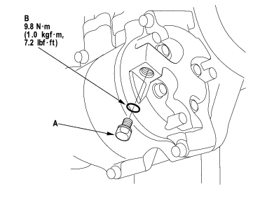 - Remove the relief valve (A), and the O-ring (B). Plug the opening to keep foreign matter from entering the system and the compressor oil from running out.
