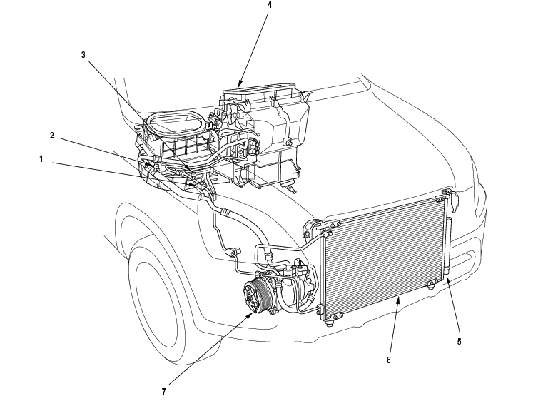 The air conditioning system removes heat from the passenger compartment by circulating refrigerant through the system as shown below.
