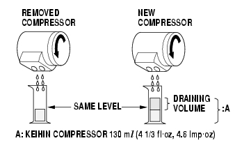 NOTE: Even if no oil is drained from the removed compressor, don't drain more than 50 ml (1 2/3 fl·oz, 1.8 lmp·oz) from the new compressor.
