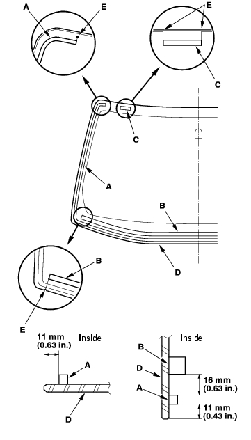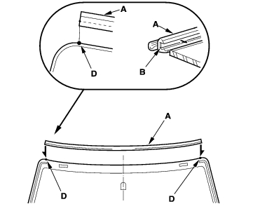 - Glue the rubber dam (A), dashboard seal (B), and fasteners (C) to the inside face of the windshield (D) as shown: