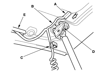 - Disconnect the rear window defogger connectors (A), and release the wire harnesses (B) and harness holders (C) from both hatch glass support strut brackets (D). On the right side, release the wire harness from the wire harness trim (E).